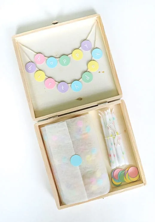 DIY Confetti Birthday Box (via Sugar & Cloth) “A polka dot-decorated box! What could be inside.. ?” These are no doubt the thoughts running through the head before being presented front and center with a Happy Birthday message complete with cookies and confetti, as presented in this lovely DIY.