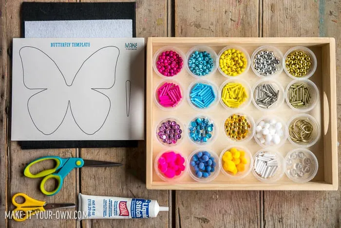 - Print out the butterfly templates or draw your own. Cut out the wing shape and the body. Pin or tape them to your felt. Either trace around the templates or simply cut around them. We went with two different colours of felt to make each of the parts easy to distinguish. Doing a rough cut, followed by a more detailed one is often easier for children as it removes excess paper that they need to maneuver around. For those hard to reach spots on the wings cut in from two directions as shown.