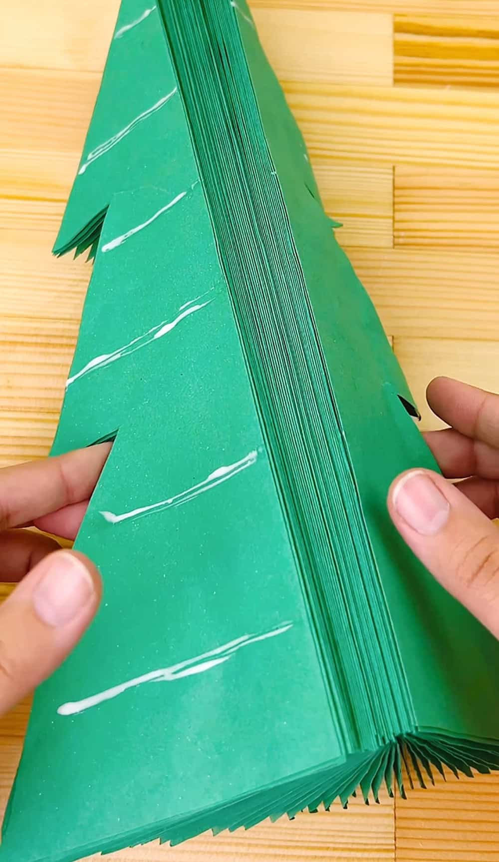 Start with unfolding 1 tree piece, Add thin horizontal glue lines on one half as shown, fold and press again.
