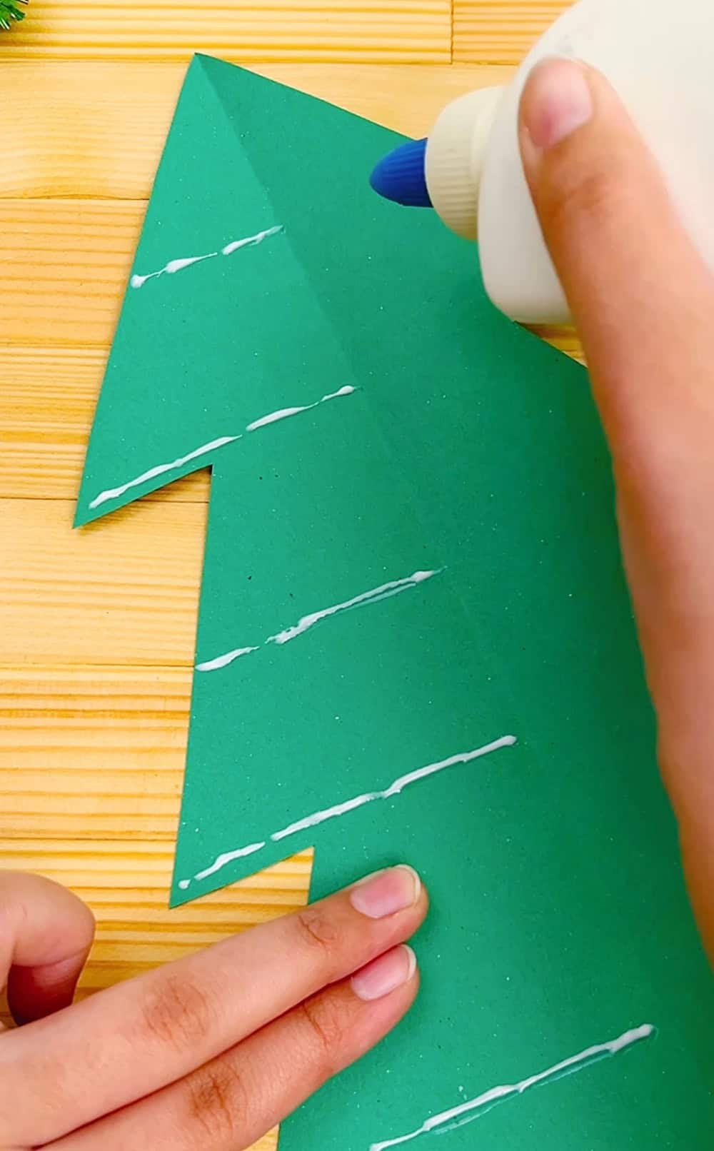 Start with unfolding 1 tree piece, Add thin horizontal glue lines on one half as shown, fold and press again.