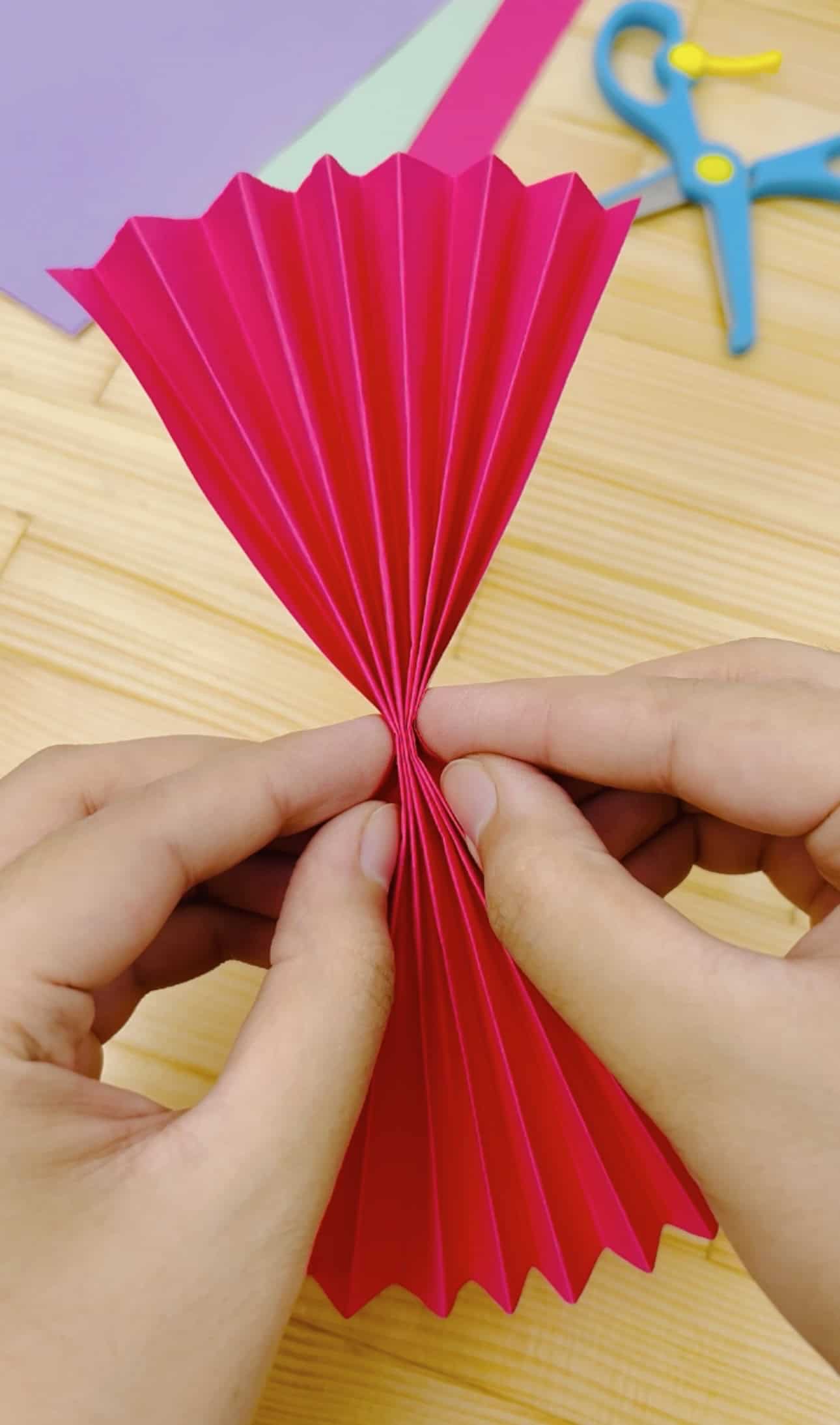 Fold a sheet of colored paper (19x19cm) back and forth like a fan.